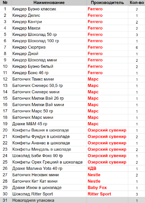 Вес: 1728 гр.Состав: Буэно классик 2 шт, Делис 1 шт, Кантри 2 шт, Макси 2 шт, Шоколад 50 гр 3 шт, Шоколад 100 гр 1 шт, Сюрприз 6 шт, Джой 1 шт, Шоколад мини 2 шт, Буэно белый 2шт, Бонс 46 гр 1 шт, Твикс мини 1 шт, Сникерс 50,5гр 1 шт, Сникерс мини 1 шт, Милки Вэй 26гр 1 шт, Милки Вэй мини 1 шт, Вишня в шоколаде 1 шт, Фундук в шоколаде 2 шт, Ананас в шоколаде 1 шт, Миндаль в
