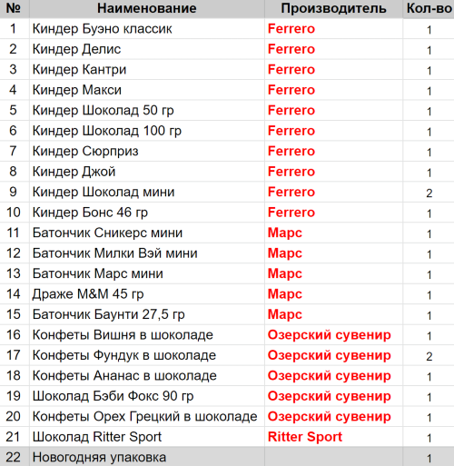 Вес: 805 гр.Состав: Буэно классик 1 шт, Делис 1 шт, Кантри 1 шт, Макси 1 шт, Шоколад 50 гр 1 шт, Шоколад 100 гр 1 шт, Сюрприз 1 шт, Джой 1 шт, Шоколад мини 2 шт, Бонс 46 гр 1 шт, Сникерс мини 1 шт, Милки Вэй мини 1 шт, Вишня в шоколаде 1 шт, Фундук в шоколаде 2 шт, Ананас в шоколаде 1 шт, Марс мини 1 шт, Беби Фокс 90гр 1 шт, Драже M&M 45гр 1 шт, Орех грецкий .в шокол