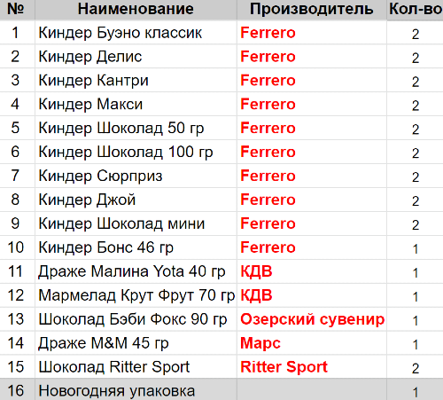 Вес: 1269 гр.Состав: Буэно классик 2 шт, Делис 2 шт, Кантри 2 шт, Макси 2 шт, Шоколад 50 гр 2 шт, Шоколад 100 гр 2 шт, Сюрприз 2 шт, Джой 2 шт, Шоколад мини 2 шт, Бонс 46 гр 1 шт, Малина Yota 40гр 1 шт, Мармелад Крут Фрут 70гр 1 шт, Беби Фокс 90гр 1 шт, Драже M&M 45гр 1 шт, Шоколад Ritter Sport 2 шт