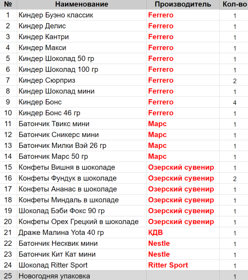 Вес: 904 гр.Состав: Буэно классик 1 шт, Делис 1 шт, Кантри 1 шт, Макси 1 шт, Шоколад 50 гр 1 шт, Шоколад 100 гр 1 шт, Сюрприз 2 шт, Шоколад мини 1 шт, Бонс 4 шт, Бонс 46 гр 1 шт, Твикс мини 1 шт, Сникерс мини 1 шт, Милки Вэй 26гр 1 шт, Вишня в шоколаде 1 шт, Фундук в шоколаде 2 шт, Ананас в шоколаде 1 шт, Миндаль в шоколаде 1 шт, Марс 50гр 1 шт, Малина Yota 40гр 1