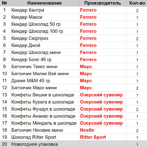 Вес: 694 гр.Состав: Кантри 2 шт, Макси 1 шт, Шоколад 50 гр 1 шт, Шоколад 100 гр 1 шт, Сюрприз 2 шт, Джой 1 шт, Шоколад мини 1 шт, Бонс 46 гр 1 шт, Твикс мини 1 шт, Милки Вэй мини 1 шт, Вишня в шоколаде 1 шт, Курага в шоколаде 1 шт, Фундук в шоколаде 2 шт, Ананас в шоколаде 1 шт, Миндаль в шоколаде 1 шт, Марс мини 2 шт, Несквик мини 2 шт, Драже M&M 45гр 1 шт, Шоколад R