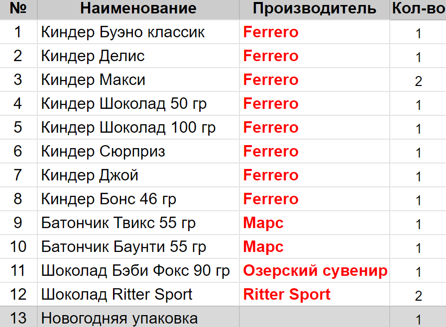 Вес: 869 гр.Состав: Буэно классик 1 шт, Делис 1 шт, Макси 2 шт, Шоколад 50 гр 1 шт, Шоколад 100 гр 1 шт, Сюрприз 1 шт, Джой 1 шт, Бонс 46 гр 1 шт, Твикс 55гр 1 шт, Беби Фокс 90гр 1 шт, Баунти 55 гр 1 шт, Шоколад Ritter Sport 2 шт