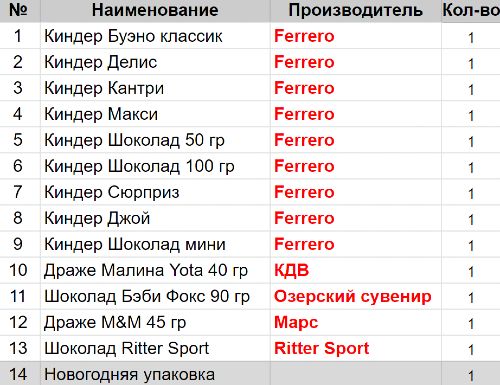 Вес: 677 гр.Состав: Буэно классик 1 шт, Делис 1 шт, Кантри 1 шт, Макси 1 шт, Шоколад 50 гр 1 шт, Шоколад 100 гр 1 шт, Сюрприз1 шт, Джой 1 шт, Шоколад мини 1 шт, Малина Yota 40гр 1 шт, Беби Фокс 90гр 1 шт, Драже M&M 45гр 1 шт, Шоколад Ritter Sport 1 шт