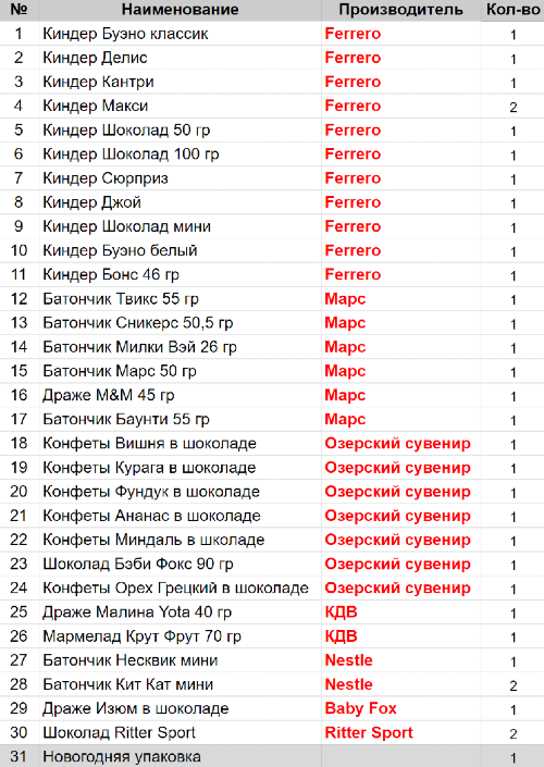 Вес: 1378 гр.Состав: Буэно классик 1 шт, Делис 1 шт, Кантри 1 шт, Макси 2 шт, Шоколад 50 гр 1 шт, Шоколад 100 гр 1 шт, Сюрприз 1 шт, Джой 1 шт, Шоколад мини 1 шт, Буэно белый 1шт, Бонс 46 гр 1 шт, Твикс 55гр 1 шт, Сникерс 50,5гр 1 шт, Милки Вэй 26гр 1 шт, Вишня в шоколаде 1 шт, Курага в шоколаде 1 шт, Фундук в шоколаде 1 шт, Ананас в шоколаде 1 шт, Миндаль в шоколаде 1 шт,