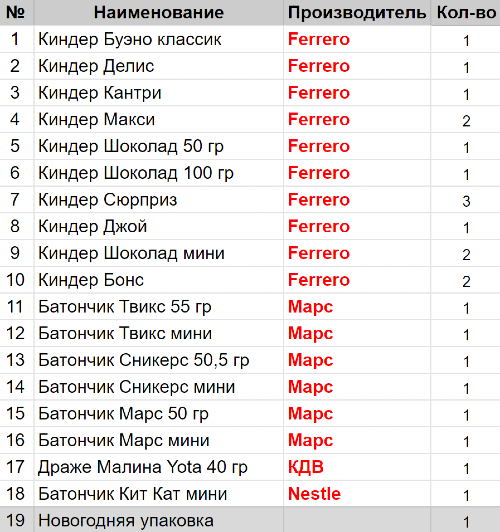 Вес: 752 гр.Состав: Буэно классик 1 шт, Делис 1 шт, Кантри 1 шт, Макси 2 шт, Шоколад 50 гр 1 шт, Шоколад 100 гр 1 шт, Сюрприз 3 шт, Джой 1 шт, Шоколад мини 2 шт, Бонс 2 шт, Твикс 55гр 1 шт, Твикс мини 1 шт, Сникерс 50,5гр 1 шт, Сникерс мини 1 шт, Марс 50гр 1 шт, Малина Yota 40гр 1 шт, Марс мини 1 шт, , Кит Кат мини 1 шт