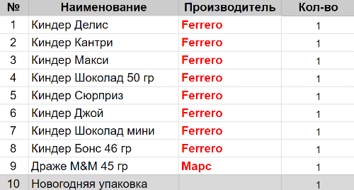 Вес: 371 гр.Состав: Делис 1 шт, Кантри 1 шт, Макси 1 шт, Шоколад 50 гр 1 шт, Сюрприз 1 шт, Джой 1 шт, Шоколад мини 1 шт, Бонс 46 гр 1 шт, Драже M&M 45гр 1 шт