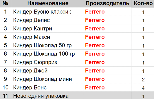 Вес: 409 гр.Состав: Буэно классик 1 шт, Делис 1 шт, Кантри 1 шт, Макси 1 шт, Шоколад 50 гр 1 шт, Шоколад 100 гр 1 шт, Сюрприз 1 шт, Джой 1 шт, Шоколад мини 2 шт, Бонс 4 шт