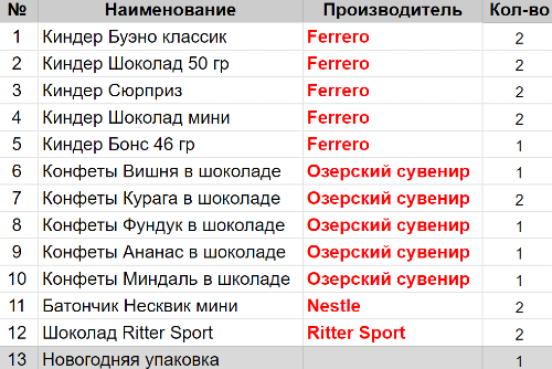 Вес: 664 гр.Состав: Буэно классик 2 шт, Шоколад 50 гр 2 шт, Сюрприз 2 шт, Шоколад мини 2 шт, Бонс 46 гр 1 шт, Вишня в шоколаде 1 шт, Курага в шоколаде 2 шт, Фундук в шоколаде 1 шт, Ананас в шоколаде 1 шт, Миндаль в шоколаде 1 шт, Несквик мини 2 шт, Шоколад Ritter Sport 2 шт