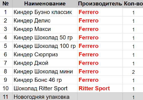 Вес: 512 гр.Состав: Буэно классик 1 шт, Делис 1 шт, Макси 1 шт, Шоколад 50 гр 1 шт, Шоколад 100 гр 1 шт, Сюрприз 1 шт, Джой 1 шт, Шоколад мини 2 шт, Бонс 46 гр 1 шт, Шоколад Ritter Sport 1 шт