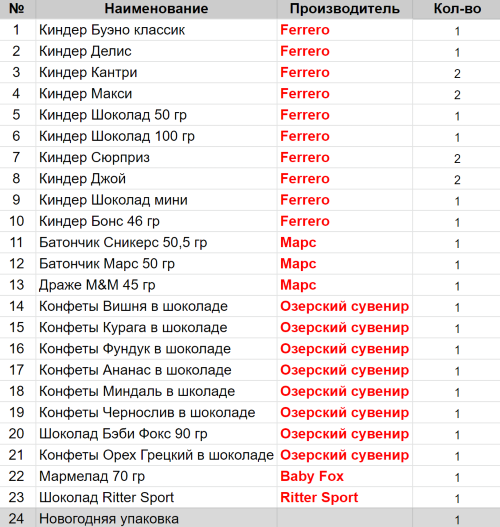 Вес: 1053 гр.Состав: Киндер Буэно классик 1шт, Киндер Делис 1шт, Киндер Кантри 2шт, Киндер Макси 2шт, Киндер Шоколад 50 гр 1шт, Киндер Шоколад 100 гр 1шт, Киндер Сюрприз 2шт, Киндер Джой 2шт, Киндер Шоколад мини 1шт, Киндер Бонс 46 гр 1шт, Батончик Сникерс 50,5 гр 1шт, Батончик Марс 50 гр 1шт, Драже M&M 45 гр 1шт, Конфеты Вишня в шоколаде 1шт, Конфеты Курага в шоколаде 1шт, Конфеты Фундук в шоколаде 1шт, Конфеты Ананас в шоколаде 1шт, Конфеты Миндаль в школаде 1шт, Конфеты Чернослив в шоколаде 1шт, Шоколад Бэби Фокс 90 гр 1шт, Конфеты Орех Грецкий в шоколаде 1шт, Мармелад 70 гр 1шт, Шоколад Ritter Sport 1шт