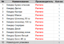 Вес: 468 гр.Состав: Буэно классик 1 шт, Делис 1 шт, Кантри 1 шт, Макси 1 шт, Шоколад 50 гр 1 шт, Шоколад 100 гр 1 шт, Сюрприз 1 шт, Джой 1 шт, Шоколад мини 1 шт, Буэно белый 1шт, Бонс 46 гр 1 шт