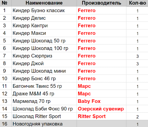 Вес: 1080 гр.Состав: Буэно классик 1 шт, Делис 1 шт, Кантри 1 шт, Макси 1 шт, Шоколад 50 гр 1 шт, Шоколад 100 гр 1 шт, Сюрприз 3 шт, Джой 3 шт, Шоколад мини 1 шт, Бонс 46 гр 1 шт, Твикс 55гр 1 шт, Мармелад Крут Фрут 70гр 1 шт, Беби Фокс 90гр 1 шт, Драже M&M 45гр 1 шт, Шоколад Ritter Sport 2 шт