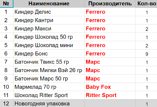 Вес: 538 гр.Состав: Делис 1 шт, Кантри 1 шт, Макси 2 шт, Шоколад 50 гр 1 шт, Шоколад мини 2 шт, Бонс 9 шт, Твикс 55гр 1 шт, Милки Вэй 26гр 1 шт, Марс 50гр 1 шт, Мармелад Крут Фрут 70гр 1 шт, Шоколад Ritter Sport 1 шт