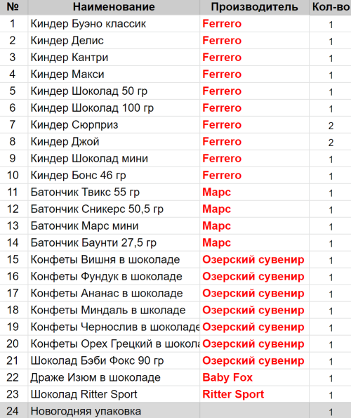 Вес: 938 гр.Киндер Буэно классик 1шт, Киндер Делис 1шт, Киндер Кантри 1шт, Киндер Макси 1шт, Киндер Шоколад 50 гр 1шт, Киндер Шоколад 100 гр 1шт, Киндер Сюрприз 2шт, Киндер Джой 2шт, Киндер Шоколад мини 1шт, Киндер Бонс 46 гр 1шт, Батончик Твикс 55 гр 1шт, Батончик Сникерс 50,5 гр 1шт, Батончик Марс мини 1шт, Батончик Баунти 27,5 гр 1шт, Конфеты Вишня в шоколаде 1шт, Конфеты Фундук в шоколаде 1шт, Конфеты Ананас в шоколаде 1шт, Конфеты Миндаль в шоколаде 1шт, Конфеты Чернослив в шоколаде 1шт, Конфеты Орех Грецкий в шоколаде 1шт, Шоколад Бэби Фокс 90 гр 1шт, Драже Изюм в шоколаде 1шт, Шоколад Ritter Sport 1шт