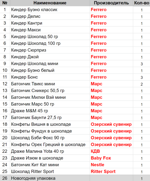 Вес: 1033 гр.Киндер Буэно классик 1шт, Киндер Делис 1шт, Киндер Кантри 1шт, Киндер Макси 1шт, Киндер Шоколад 50 гр 1шт, Киндер Шоколад 100 гр 1шт, Киндер Сюрприз 1шт, Киндер Джой 1шт, Киндер Шоколад мини 3шт, Киндер Буэно белый 1шт, Киндер Бонс 3шт, Батончик Твикс мини 2шт, Батончик Сникерс 50,5 гр 1шт, Батончик Милки Вэй мини 1шт, Батончик Марс 50 гр 1шт, Драже M&M 45 гр 1шт, Батончик Баунти 27,5 гр 1шт, Конфеты Вишня в шоколаде 1шт, Конфеты Фундук в шоколаде 1шт, Шоколад Бэби Фокс 90 гр 1шт, Конфеты Орех Грецкий в шоколаде 1шт, Драже Малина Yota 40 гр 1шт, Драже Изюм в шоколаде 1шт, Батончик Кит Кат мини 1шт, Шоколад Ritter Sport 1шт