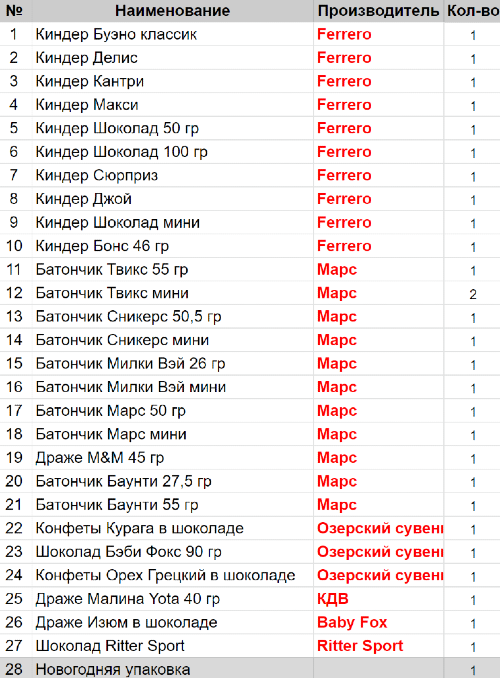 Вес: 1129 гр.Состав: Киндер Буэно классик 1шт, Киндер Делис 1шт, Киндер Кантри 1шт, Киндер Макси 1шт, Киндер Шоколад 50 гр 1шт, Киндер Шоколад 100 гр 1шт, Киндер Сюрприз 1шт, Киндер Джой 1шт, Киндер Шоколад мини 1шт, Киндер Бонс 46 гр 1шт, Батончик Твикс 55 гр 1шт, Батончик Твикс мини 2шт, Батончик Сникерс 50,5 гр 1шт, Батончик Сникерс мини 1шт, Батончик Милки Вэй 26 гр 1шт, Батончик Милки Вэй мини 1шт, Батончик Марс 50 гр 1шт, Батончик Марс мини 1шт, Драже M&M 45 гр 1шт, Батончик Баунти 27,5 гр 1шт, Батончик Баунти 55 гр 1шт, Конфеты Курага в шоколаде 1шт, Шоколад Бэби Фокс 90 гр 1шт, Конфеты Орех Грецкий в шоколаде 1шт, Драже Малина Yota 40 гр 1шт, Драже Изюм в шоколаде 1шт, Шоколад Ritter Sport 1шт