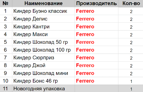 Вес: 790 гр.Состав: Буэно классик 2 шт, Делис 2 шт, Кантри 2 шт, Макси 2 шт, Шоколад 50 гр 2 шт, Шоколад 100 гр 2 шт, Сюрприз 2 шт, Джой 2 шт, Шоколад мини 2 шт, Бонс 46 гр 1 шт