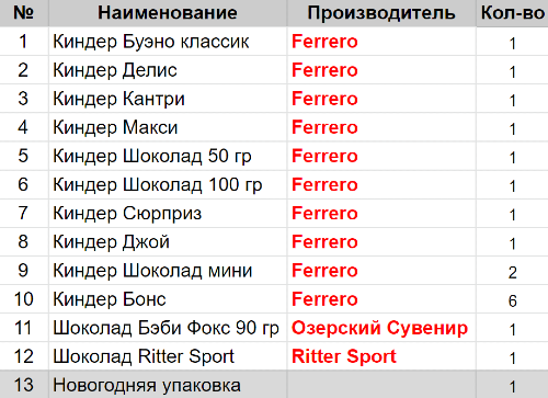 Вес: 630 гр.Состав: Буэно классик 1 шт, Делис 1 шт, Кантри 1 шт, Макси 1 шт, Шоколад 50 гр 1 шт, Шоколад 100 гр 1 шт, Сюрприз 1 шт, Джой 1 шт, Шоколад мини 2 шт, Бонс 6 шт, Шоколад Бэби Фокс 90 гр 1шт, Шоколад Ritter Sport 1 шт