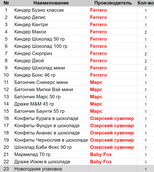 Вес: 991 гр.Состав: Киндер Буэно классик 1шт, Киндер Делис 1шт, Киндер Кантри 1шт, Киндер Макси 2шт, Киндер Шоколад 50 гр 1шт, Киндер Шоколад 100 гр 1шт, Киндер Сюрприз 2шт, Киндер Джой 2шт, Киндер Шоколад мини 2шт, Киндер Бонс 46 гр 1шт, Батончик Сникерс мини 1шт, Батончик Милки Вэй мини 1шт, Батончик Марс 50 гр 1шт, Драже M&M 45 гр 1шт, Батончик Баунти 55 гр 1шт, Конфеты Курага в шоколаде 1шт, Конфеты Фундук в шоколаде 1шт, Конфеты Ананас в шоколаде 1шт, Конфеты Чернослив в шоколаде 1шт, Шоколад Бэби Фокс 90 гр 1шт, Мармелад 70 гр 1шт, Драже Изюм в шоколаде 1шт