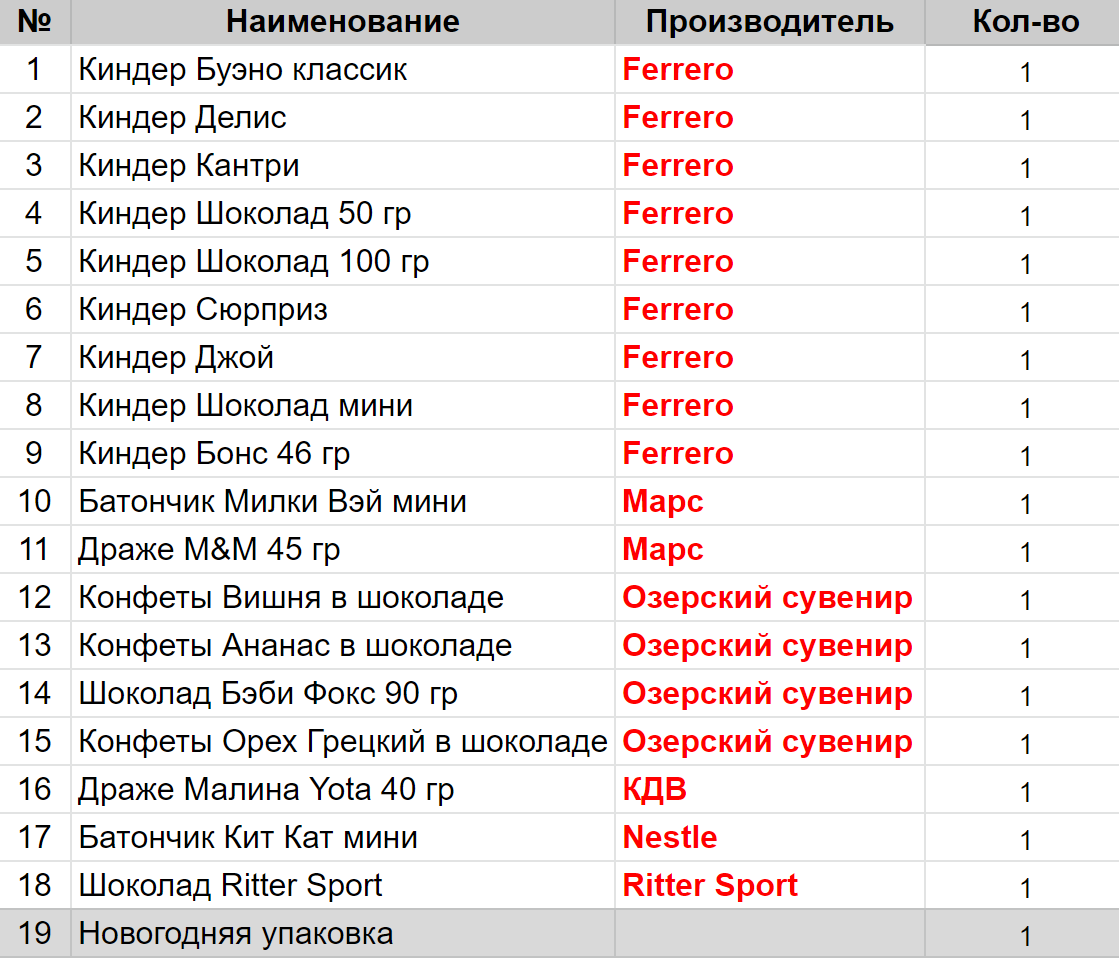 Вес: 808 гр.Состав: Буэно классик 1 шт, Делис 1 шт, Кантри 1 шт, Шоколад 50 гр 1 шт, Шоколад 100 гр 1 шт, Сюрприз 1 шт, Джой 1 шт, Шоколад мини1 шт, Бонс 46 гр 1 шт, Милки Вэй мини 1 шт, Вишня в шоколаде 1 шт, Ананас в шоколаде 1 шт, Малина Yota 40гр 1 шт, Беби Фокс 90гр 1 шт, Драже M&M 45гр 1 шт, Кит Кат мини 1 шт, Орех грецкий .в шоколаде 1 шт, Шоколад Ritte