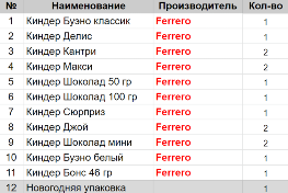 Вес: 548 гр.Состав: Буэно классик 1 шт, Делис 1 шт, Кантри 2 шт, Макси 2 шт, Шоколад 50 гр 1 шт, Шоколад 100 гр 1 шт, Сюрприз 1 шт, Джой 2 шт, Шоколад мини 2 шт, Буэно белый 1шт, Бонс 46 гр 1 шт