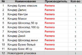 Вес: 496 гр.Состав: Буэно классик 1 шт, Делис 1 шт, Кантри 1 шт, Макси 1 шт, Шоколад 50 гр 1 шт, Шоколад 100 гр 1 шт, Сюрприз 1 шт, Джой 2 шт, Шоколад мини 1 шт, Буэно белый 1шт, Бонс 46 гр 1 шт