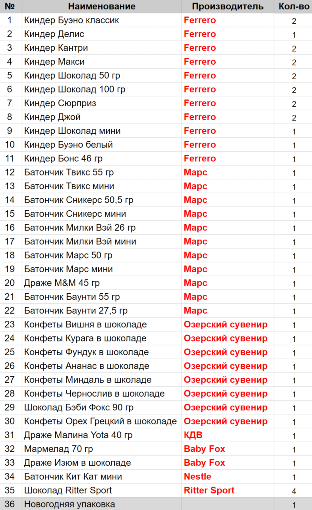 Вес: 1137 гр.Состав: Киндер Буэно классик 2шт, Киндер Делис 1шт, Киндер Кантри 2шт, Киндер Макси 2шт, Киндер Шоколад 50 гр 2шт, Киндер Шоколад 100 гр 2шт, Киндер Сюрприз 2шт, Киндер Джой 2шт, Киндер Шоколад мини 1шт, Киндер Буэно белый 1шт, Киндер Бонс 46 гр 1шт, Батончик Твикс 55 гр 1шт, Батончик Твикс мини 1шт, Батончик Сникерс 50,5 гр 1шт, Батончик Сникерс мини 1шт, Батончик Милки Вэй 26 гр 1шт, Батончик Милки Вэй мини 1шт, Батончик Марс 50 гр 1шт, Батончик Марс мини 1шт, Драже M&M 45 гр 1шт, Батончик Баунти 55 г 1шт, Батончик Баунти 27,5 гр 1шт, Конфеты Вишня в шоколаде 1шт, Конфеты Курага в шоколаде 1шт, Конфеты Фундук в шоколаде 1шт, Конфеты Ананас в шоколаде 1шт, Конфеты Миндаль в шjколаде 1шт, Конфеты Чернослив в шоколаде 1шт, Шоколад Бэби Фокс 90 гр 1шт, Конфеты Орех Грецкий в шоколаде 1шт, Драже Малина Yota 40 гр 1шт, Мармелад 70 гр 1шт, Драже Изюм в шоколаде 1шт, Батончик Кит Кат мини 1шт, Шоколад Ritter Sport 4 шт