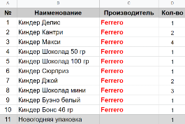 Вес: 559 гр.Состав: Делис 1 шт, Кантри 2 шт, Макси 4 шт, Шоколад 50 гр 1 шт, Шоколад 100 гр 1 шт, Сюрприз 1 шт, Джой 2 шт, Шоколад мини 3 шт, Буэно белый 1шт, Бонс 46 гр 1 шт