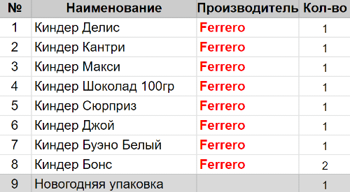 Вес: 321 гр.Состав: Делис 1 шт, Кантри 1 шт, Макси 1 шт, Шоколад 100 гр 1 шт, Сюрприз 1 шт, Джой 1 шт, Буэно белый 1 шт, Бонс мини 2 шт