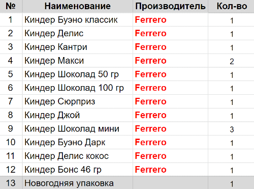 Вес: 545 гр.Состав: Буэно классик 1 шт, Делис 1 шт, Кантри 1 шт, Макси 2 шт, Шоколад 50 гр 1 шт, Шоколад 100 гр 1 шт, Сюрприз 1 шт, Джой 1 шт, Шоколад мини 3 шт, Буэно дарк 1 шт, Делис кокос 1 шт, Бонс 46 гр 1 шт