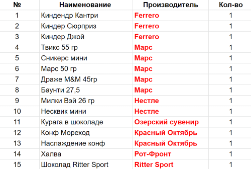 Вес: 590 гр.Состав: Кантри 1 шт, Сюрприз 1 шт, Джой 1 шт, Твикс 55гр 1 шт, Сникерс мини 1 шт, Милки Вэй 26гр 1 шт, Курага в шоколаде 1 шт, Марс 50гр 1 шт, Драже M&M 45гр 1 шт, Несквик мини 1 шт, кнф. Мореход 1 шт, Наслаждение 1 шт, Халва(РотФр) 1 шт, Баунти 27,5 гр 1 шт, Шоколад Ritter Sport 1 шт