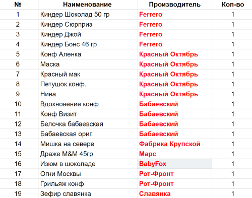 Вес: 480 гр.Состав: Шоколад 50 гр 1 шт, Сюрприз 1 шт, Джой 1 шт, Бонс 46 гр 1 шт, кнф. Аленка 1 шт, кнф Вдохновение 1 шт, кнф Мишка на севере 1 шт, Драже M&M 45гр 1 шт, Изюм в шоколаде 1 шт, Огни Москвы 1 шт, кнф. Маска 1 шт, кнф. Визит 1 шт, Красный мак 1 шт, Белочка бабаевск. 1 шт, кнф. Петушок 1 шт, кнф. Грильяж 1 шт, кнф. Нива 1 шт, Бабаевская ориг. 1 шт, Зефир Слав