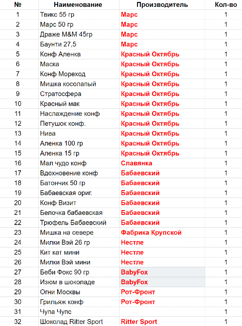 Вес: 1000 гр.Состав: Твикс 55 гр-1шт,Марс 50 гр-1шт,Драже M&M 45гр-1шт,Баунти 27,5-1шт,Конф Аленка-1шт,Маска-1шт,Конф Мореход-1шт,Мишка косолапый-1шт,Стратосфера-1шт,Красный мак-1шт,Наслаждение конф-1шт,Петушок конф.-1шт,Нива-1шт,Аленка 90 гр-1шт,Аленка 15 гр-1шт,Мал чудо конф-1шт,Вдохновение конф-1шт,Батончик 50 гр-1шт,Бабаевская ориг.-1шт,Конф Визит-1шт,Белочка бабаевская-1шт,Трюфель Бабаевский-1шт,Мишка на севере-1шт,Милки Вэй 26 гр-1шт,Кит кат мини-1шт,Милки Вэй мини-1шт,Беби Фокс 90 гр-1шт,Изюм в шоколаде РФ-1шт,Огни Москвы-1шт,Грильяж конф-1шт,Леденец на палочке-1шт,Шоколад Ritter Sport-1 шт