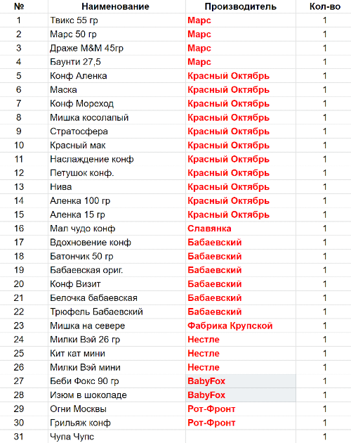 Вес: 900 гр.Состав: Твикс 55 гр-1шт,Марс 50 гр-1шт,Драже M&M 45гр-1шт,Баунти 27,5-1шт,Конф Аленка-1шт,Маска-1шт,Конф Мореход-1шт,Мишка косолапый-1шт,Стратосфера-1шт,Красный мак-1шт,Наслаждение конф-1шт,Петушок конф.-1шт,Нива-1шт,Аленка 90 гр-1шт,Аленка 15 гр-1шт,Мал чудо конф-1шт,Вдохновение конф-1шт,Батончик 50 гр-1шт,Бабаевская ориг.-1шт,Конф Визит-1шт,Белочка бабаевская-1шт,Трюфель Бабаевский-1шт,Мишка на севере-1шт,Милки Вэй 26 гр-1шт,Кит кат мини-1шт,Милки Вэй мини-1шт,Беби Фокс 90 гр-1шт,Изюм в шоколаде РФ-1шт,Огни Москвы-1шт,Грильяж конф-1шт,Леденец на палочке -1 шт