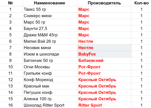 Вес: 660 гр.Состав: ТТвикс 55 гр-1 шт, Сникерс мини-1 шт, Марс 50 гр-1 шт, Баунти 27,5-1 шт, Драже M&M 45гр-1 шт, Милки Вэй 26 гр-1 шт, Несквик мини-1 шт, Изюм в шоколаде РФ-1 шт, Батончик 50 гр-1 шт, Огни Москвы-1 шт, Грильяж конф-1 шт, Конф Мореход-1 шт, Красный мак-1 шт, Петушок конф.-1 шт, Аленка 90 гр-1 шт, Шоколад Ritter Sport-1 шт