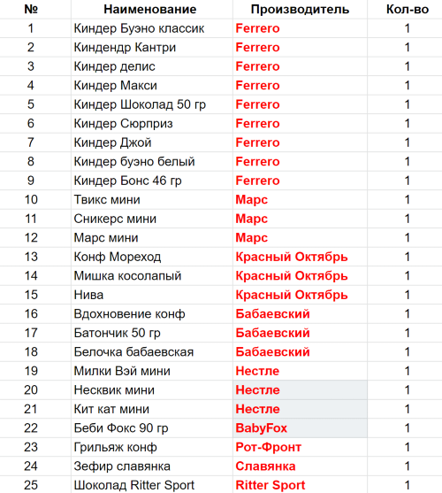Вес: 850 гр.Состав: Киндер Буэно классик-1 шт, Киндендр Кантри-1 шт, Киндер делис-1 шт, Киндер Макси-1 шт, Киндер Шоколад 50 гр-1 шт, Киндер Сюрприз-1 шт, Киндер Джой-1 шт, Киндер буэно белый-1 шт, Киндер Бонс 46 гр-1 шт, Твикс мини-1 шт, Сникерс мини-1 шт, Марс мини-1 шт, Конф Мореход-1 шт, Мишка косолапый-1 шт, Нива-1 шт, Вдохновение конф-1 шт, Батончик 50 гр-1 шт, Белочка бабаевская-1 шт, Милки Вэй мини-1 шт, Несквик мини-1 шт, Кит кат мини-1 шт, Беби Фокс 90 гр-1 шт, Грильяж конф-1 шт, Зефир славянка-1 шт, Шоколад Ritter Sport-1 шт