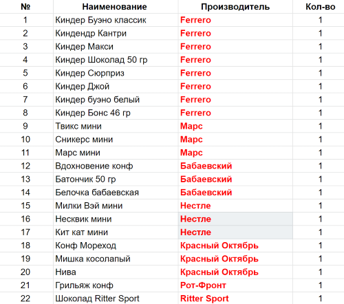 Вес: 670 гр.Состав: Киндер Буэно классик-1 шт, Киндендр Кантри-1 шт, Киндер Макси-1 шт, Киндер Шоколад 50 гр-1 шт, Киндер Сюрприз-1 шт, Киндер Джой-1 шт, Киндер буэно белый-1 шт, Киндер Бонс 46 гр-1 шт, Твикс мини-1 шт, Сникерс мини-1 шт, Марс мини-1 шт, Вдохновение конф-1 шт, Батончик 50 гр-1 шт, Белочка бабаевская-1 шт, Милки Вэй мини-1 шт, Несквик мини-1 шт, Кит кат мини-1 шт, Конф Мореход-1 шт, Мишка косолапый-1 шт, Нива-1 шт, Грильяж конф-1 шт, Шоколад Ritter Sport-1 шт