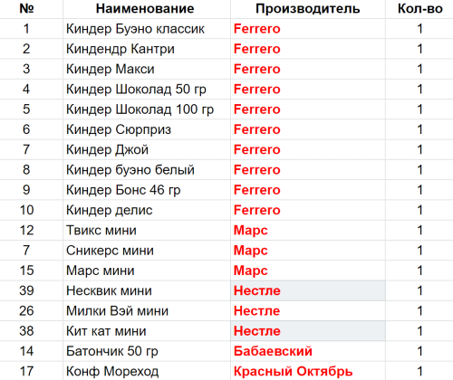 Вес: 640 гр.Состав: Буэно классик 1 шт, Делис 1 шт, Кантри 1 шт, Макси 1 шт, Шоколад 50 гр 1 шт, Шоколад 100 гр 1 шт, Сюрприз 1 шт, Джой 1 шт, Буэно белый 1 шт, Бонс 46 гр 1 шт, Твикс мини 1 шт, Сникерс мини 1 шт, Милки Вэй мини 1 шт, Марс мини 1 шт, Батончик 50гр 1 шт, Несквик мини 1 шт, кнф. Мореход 1 шт, Кит Кат мини 1 шт