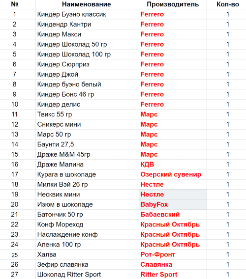 Вес: 1280 гр.Состав: Киндер Буэно классик-1 шт, Киндендр Кантри-1 шт, Киндер Макси-1 шт, Киндер Шоколад 50 гр-1 шт, Киндер Шоколад 100 гр-1 шт, Киндер Сюрприз-1 шт, Киндер Джой-1 шт, Киндер буэно белый-1 шт, Киндер Бонс 46 гр-1 шт, Киндер делис-1 шт, Твикс 55 гр-1 шт, Сникерс мини-1 шт, Марс 50 гр-1 шт, Баунти 27,5-1 шт, Драже M&M 45гр-1 шт, Драже Малина-1 шт, Курага в шоколаде-1 шт, Милки Вэй 26 гр-1 шт, Несквик мини-1 шт, Изюм в шоколаде РФ-1 шт, Батончик 50 гр-1 шт, Конф Мореход-1 шт, Наслаждение конф-1 шт, Аленка 90 гр-1 шт, Халва-1 шт, Зефир славянка-1 шт, Шоколад Ritter Sport-1 шт