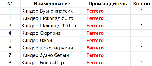 Вес: 370 гр.Состав: Буэно классик 1 шт, Шоколад 50 гр 1 шт, Шоколад 100 гр 1 шт, Сюрприз 1 шт, Джой 1 шт, Шоколад мини 1 шт, Буэно белый 1 шт, Бонс 46 гр 1 шт