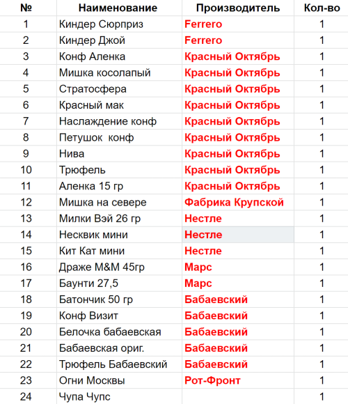 Вес: 490 гр.Состав: Киндер Сюрприз-1 шт, Киндер Джой-1 шт, Конф Аленка-1 шт, Мишка косолапый-1 шт, Стратосфера-1 шт, Красный мак-1 шт, Наслаждение конф-1 шт, Петушок конф-1 шт, Нива-1 шт, Трюфель-1 шт, Аленка 15 гр-1 шт, Мишка на севере-1 шт, Милки Вэй 26 гр-1 шт, Несквик мини-1 шт, Кит Кат мини-1 шт, Драже M&M 45гр-1 шт, Баунти 27,5-1 шт, Батончик 50 гр-1 шт, Конф Визит-1 шт, Белочка бабаевская-1 шт, Бабаевская ориг.-1 шт, Трюфель Бабаевский-1 шт, Огни Москвы-1 шт, Леденец на палочке-1 шт