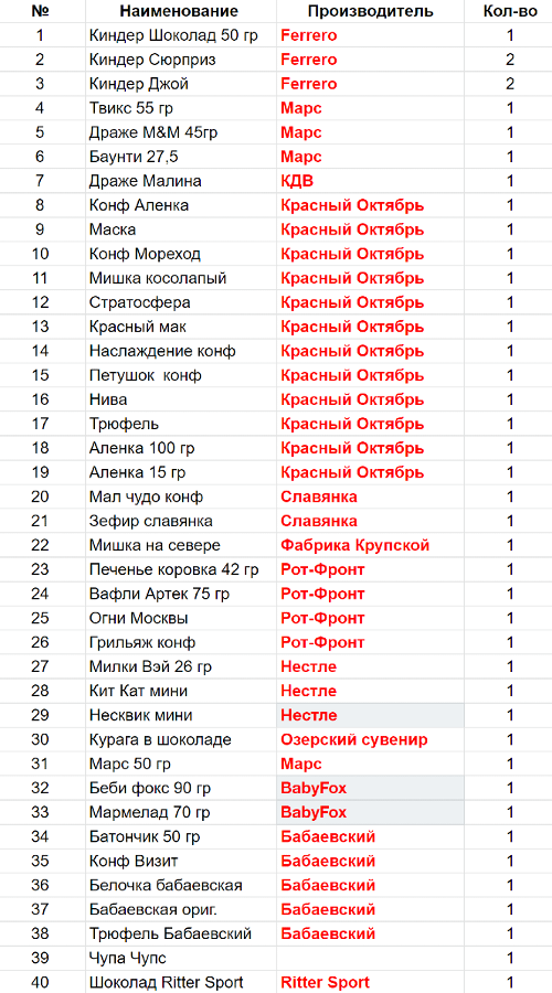 Вес: 1440 гр.Состав: Киндер Шоколад 50 гр-1 шт, Киндер Сюрприз-2 шт, Киндер Джой-2 шт, Твикс 55 гр-1 шт, Драже M&M 45гр-1 шт, Баунти 27,5-1 шт, Драже Малина-1 шт, Конф Аленка-1 шт, Маска-1 шт, Конф Мореход-1 шт, Мишка косолапый-1 шт, Стратосфера-1 шт, Красный мак-1 шт, Наслаждение конф-1 шт, Петушок конф-1 шт, Нива-1 шт, Трюфель-1 шт, Аленка 90 гр-1 шт, Аленка 15 гр-1 шт, Мал чудо конф-1 шт, Зефир славянка-1 шт, Мишка на севере-1 шт, Печенье коровка 42 гр-1 шт, Вафли Артек 75 гр-1 шт, Огни Москвы-1 шт, Грильяж конф-1 шт, Милки Вэй 26 гр-1 шт, Кит Кат мини-1 шт, Несквик мини-1 шт, Курага в шоколаде-1 шт, Марс 50 гр-1 шт, Беби фокс 90 гр-1 шт, Мармелад 70 гр-1 шт, Батончик 50 гр-1 шт, Конф Визит-1 шт, Белочка бабаевская-1 шт, Бабаевская ориг.-1 шт, Трюфель Бабаевский-1 шт, Леденец на палочке-1 шт, Шоколад Ritter Sport-1 шт