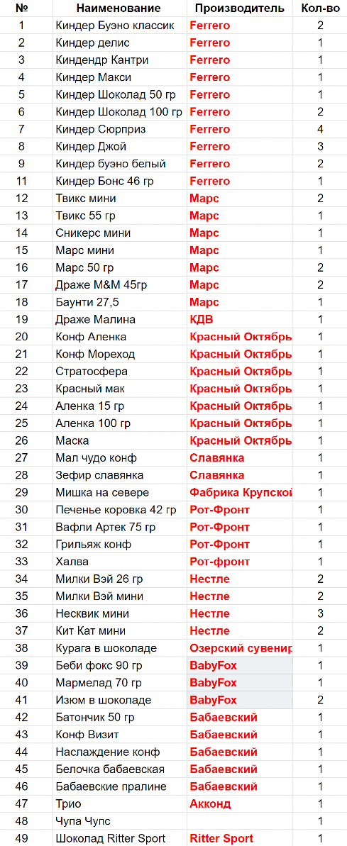 Вес: 2400 гр.Состав: Киндер Буэно классик-2 шт, Киндер делис-1 шт, Киндер Кантри-1 шт, Киндер Макси-1 шт, Киндер Шоколад 50 гр-1 шт, Киндер Шоколад 100 гр-2 шт, Киндер Сюрприз-4 шт, Киндер Джой-3 шт, Киндер буэно белый-2 шт, Киндер Бонс 46 гр-1 шт, Твикс мини-2 шт, Твикс 55 гр-1 шт, Сникерс мини-1 шт, Марс мини-1 шт, Марс 50 гр-2 шт, Драже M&M 45гр-2 шт, Баунти мини-1 шт, Драже Малина-1 шт, Конф Аленка-1 шт, Конф Мореход-1 шт, Стратосфера-1 шт, Красный мак-1 шт, Аленка 15 гр-1 шт, Аленка 90 гр-1 шт, Маска-1 шт, Мал чудо конф-1 шт, Зефир славянка-1 шт, Мишка на севере-1 шт, Печенье коровка 42 гр-1 шт, Вафли Артек 75 гр-1 шт, Грильяж конф-1 шт, Халва-1 шт, Милки Вэй 26 гр-2 шт, Милки Вэй мини-2 шт, Несквик мини-3 шт, Кит Кат мини-3 шт, Курага в шоколаде-1 шт, Беби фокс 90 гр-1 шт, Мармелад 70 гр-1 шт, Изюм в шоколаде РФ-2 шт, Батончик 50 гр-1 шт, Конф Визит-1 шт, Наслаждение конф-1 шт, Белочка бабаевская-1 шт, Шоколадный вкус-1 шт, Трио-1 шт, Леденец на палочке-1 шт, Шоколад Ritter Sport-1 шт