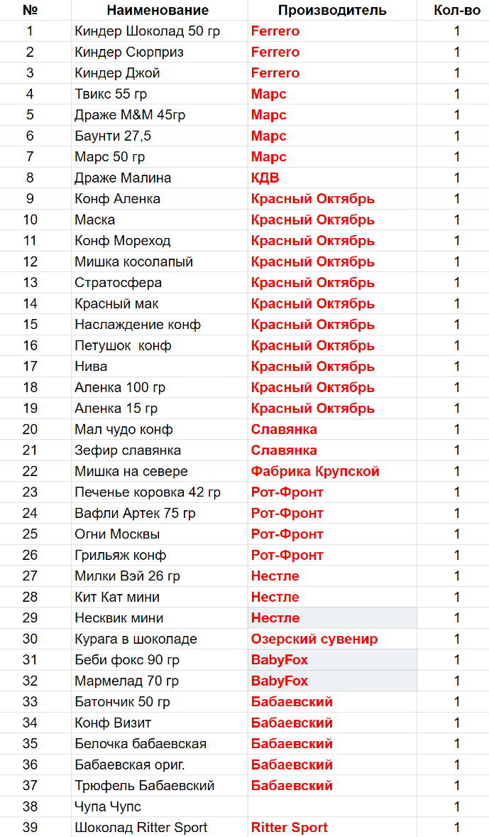 Вес: 1360 гр.Состав: Киндер Шоколад 50 гр- 1 шт, Киндер Сюрприз- 1 шт, Киндер Джой- 1 шт, Твикс 55 гр- 1 шт, Драже M&M 45гр- 1 шт, Баунти 27,5- 1 шт, Марс 50 гр- 1 шт, Драже Малина- 1 шт, Конф Аленка- 1 шт, Маска- 1 шт, Конф Мореход- 1 шт, Мишка косолапый- 1 шт, Стратосфера- 1 шт, Красный мак- 1 шт, Наслаждение конф- 1 шт, Петушок конф- 1 шт, Нива- 1 шт, Аленка 90 гр- 1 шт, Аленка 15 гр- 1 шт, Мал чудо конф- 1 шт, Зефир славянка- 1 шт, Мишка на севере- 1 шт, Печенье коровка 42 гр- 1 шт, Вафли Артек 75 гр- 1 шт, Огни Москвы- 1 шт, Грильяж конф- 1 шт, Милки Вэй 26 гр- 1 шт, Кит Кат мини- 1 шт, Несквик мини- 1 шт, Курага в шоколаде- 1 шт, Беби фокс 90 гр- 1 шт, Мармелад 70 гр- 1 шт, Батончик 50 гр- 1 шт, Конф Визит- 1 шт, Белочка бабаевская- 1 шт, Бабаевская ориг.- 1 шт, Трюфель Бабаевский- 1 шт, Леденец на палочке- 1 шт, Шоколад Ritter Sport- 1 шт
