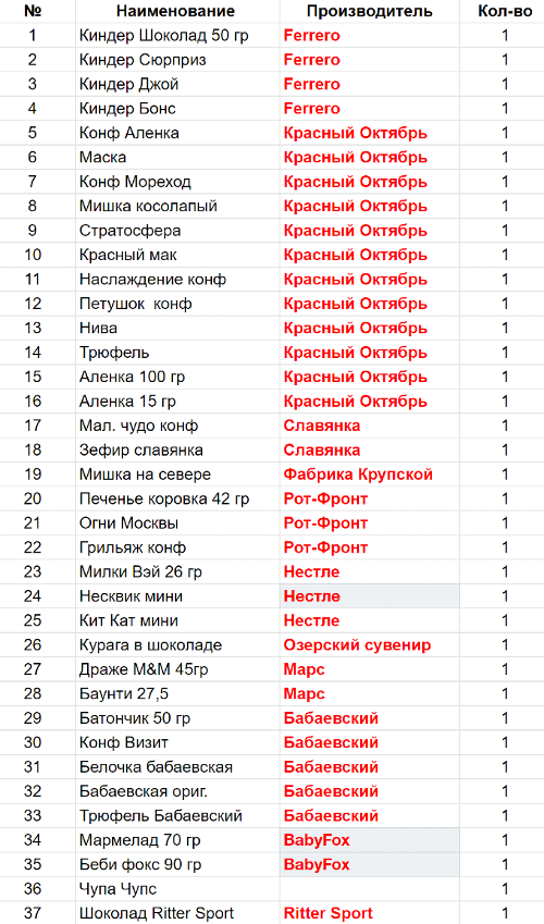 Вес: 1150 гр.Состав: Киндер Шоколад 50 гр-1 шт, Киндер Сюрприз-1 шт, Киндер Джой-1 шт, Киндер Бонс-1 шт, Конф Аленка-1 шт, Маска-1 шт, Конф Мореход-1 шт, Мишка косолапый-1 шт, Стратосфера-1 шт, Красный мак-1 шт, Наслаждение конф-1 шт, Петушок конф-1 шт, Нива-1 шт, Трюфель-1 шт, Аленка 90 гр-1 шт, Аленка 15 гр-1 шт, Мал. чудо конф-1 шт, Зефир славянка-1 шт, Мишка на севере-1 шт, Печенье коровка 42 гр-1 шт, Огни Москвы-1 шт, Грильяж конф-1 шт, Милки Вэй 26 гр-1 шт, Несквик мини-1 шт, Кит Кат мини-1 шт, Курага в шоколаде-1 шт, Драже M&M 45гр-1 шт, Баунти 27,5-1 шт, Батончик 50 гр-1 шт, Конф Визит-1 шт, Белочка бабаевская-1 шт, Бабаевская ориг.-1 шт, Трюфель Бабаевский-1 шт, Мармелад 70 гр-1 шт, Беби фокс 90 гр-1 шт, Леденец на палочке-1 шт, Шоколад Ritter Sport - 1 шт