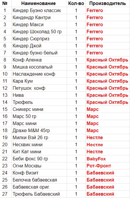 Вес: 720 гр.Состав: Киндер Буэно классик- 1 шт, Киндендр Кантри- 1 шт, Киндер Макси- 1 шт, Киндер Шоколад 50 гр- 1 шт, Киндер Сюрприз- 1 шт, Киндер Джой- 1 шт, Киндер буэно белый- 1 шт, Конф Аленка- 1 шт, Мишка косолапый- 1 шт, Наслаждение конф- 1 шт, Кара Кум- 1 шт, Петушок конф- 1 шт, Нива- 1 шт, Трюфель- 1 шт, Сникерс мини- 1 шт, Марс 50 гр- 1 шт, Марс мини- 1 шт, Драже M&M 45гр- 1 шт, Милки Вэй 26 гр- 1 шт, Несквик мини- 1 шт, Кит Кат мини- 1 шт, Беби фокс 90 гр- 1 шт, Огни Москвы- 1 шт, Конф Визит- 1 шт, Белочка бабаевская- 1 шт, Бабаевская ориг.- 1 шт, Трюфель Бабаевский- 1 шт