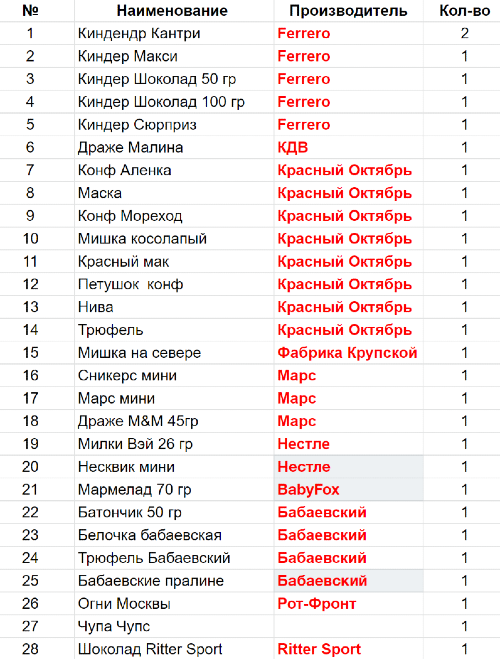 Вес: 920 гр.Состав: индер Кантри- 2 шт, Киндер Макси- 1 шт, Киндер Шоколад 50 гр- 1 шт, Киндер Шоколад 100 гр- 1 шт, Киндер Сюрприз- 1 шт, Драже Малина- 1 шт, Конф Аленка- 1 шт, Маска- 1 шт, Конф Мореход- 1 шт, Мишка косолапый- 1 шт, Красный мак- 1 шт, Петушок конф- 1 шт, Нива- 1 шт, Трюфель- 1 шт, Мишка на севере- 1 шт, Сникерс мини- 1 шт, Марс мини- 1 шт, Драже M&M 45гр- 1 шт, Милки Вэй 26 гр- 1 шт, Несквик мини- 1 шт, Мармелад 70 гр- 1 шт, Батончик 50 гр- 1 шт, Белочка бабаевская- 1 шт, Трюфель Бабаевский- 1 шт, Бабаевские пралине- 1 шт, Огни Москвы- 1 шт, Леденец на палочке- 1 шт, Шоколад Ritter Sport-1 шт