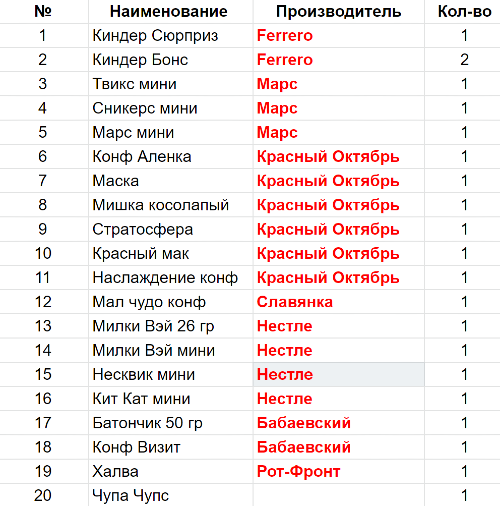 Вес: 350 гр.Состав: Сюрприз 1 шт, Бонс 2 шт, Твикс мини 1 шт, кнф. Аленка 1 шт, кнф. Мал.чудо 1 шт, Сникерс мини 1 шт, Милки Вэй 26гр 1 шт, Милки Вэй мини 1 шт, Марс мини 1 шт, Батончик 50гр 1 шт, кнф. Маска 1 шт, кнф. Визит 1 шт, Несквик мини 1 шт, Мишка косолап. 1 шт, Стратосфера 1 шт, Красный мак 1 шт, кнф. Наслаждение 1 шт, Халва(РотФр) 1 шт, Леденец на палочке1 шт, Кит Кат мини
