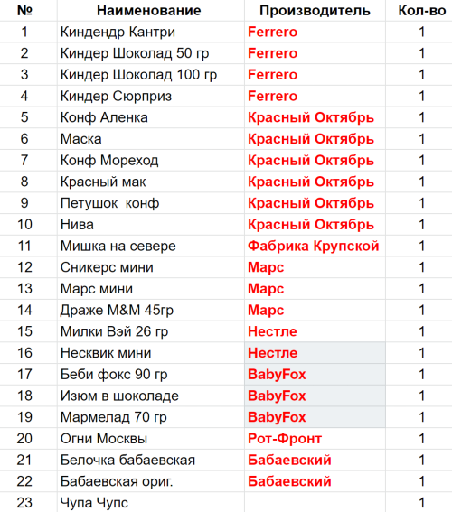 Вес: 820 гр.Состав: Киндер Кантри- 1 шт, Киндер Шоколад 50 гр- 1 шт, Киндер Шоколад 100 гр- 1 шт, Киндер Сюрприз- 1 шт, Конф Аленка- 1 шт, Маска- 1 шт, Конф Мореход- 1 шт, Красный мак- 1 шт, Петушок конф- 1 шт, Нива- 1 шт, Мишка на севере- 1 шт, Сникерс мини- 1 шт, Марс мини- 1 шт, Драже M&M 45гр- 1 шт, Милки Вэй 26 гр- 1 шт, Несквик мини- 1 шт, Беби фокс 90 гр- 1 шт, Изюм в шоколаде РФ- 1 шт, Мармелад 70 гр- 1 шт, Огни Москвы- 1 шт, Белочка бабаевская- 1 шт, Бабаевская ориг.- 1 шт, Леденец на палочке- 1 шт