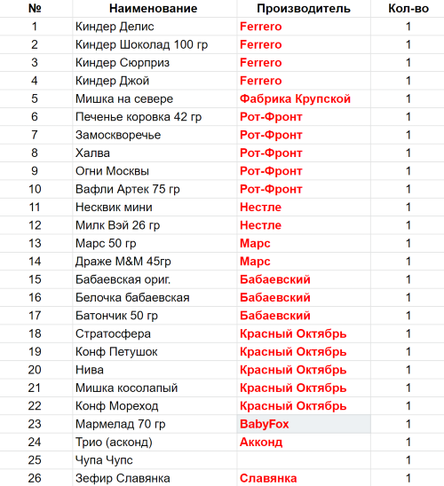 Вес: 900 гр.Состав: Киндер Делис-1шт, Киндер Шоколад 100 гр-1шт, Киндер Сюрприз-1шт, Киндер Джой-1шт, Мишка на севере-1шт, Печенье коровка 42 гр-1шт, Замоскворечье-1шт, Халва-1шт, Огни Москвы-1шт, Вафли Артек 75 гр-1шт, Несквик мини-1шт, Милк Вэй 26 гр-1шт, Марс 50 гр-1шт, Драже M&M 45гр-1шт, Бабаевская ориг.-1шт, Белочка бабаевская-1шт, Батончик 50 гр-1шт, Стратосфера-1шт, Конф Петушок-1шт, Нива-1шт, Мишка косолапый-1шт, Конф Мореход-1шт, Мармелад 70 гр-1шт, Трио (асконд)-1шт, Леденец на палочке-1шт, Зефир Славянка-1 шт